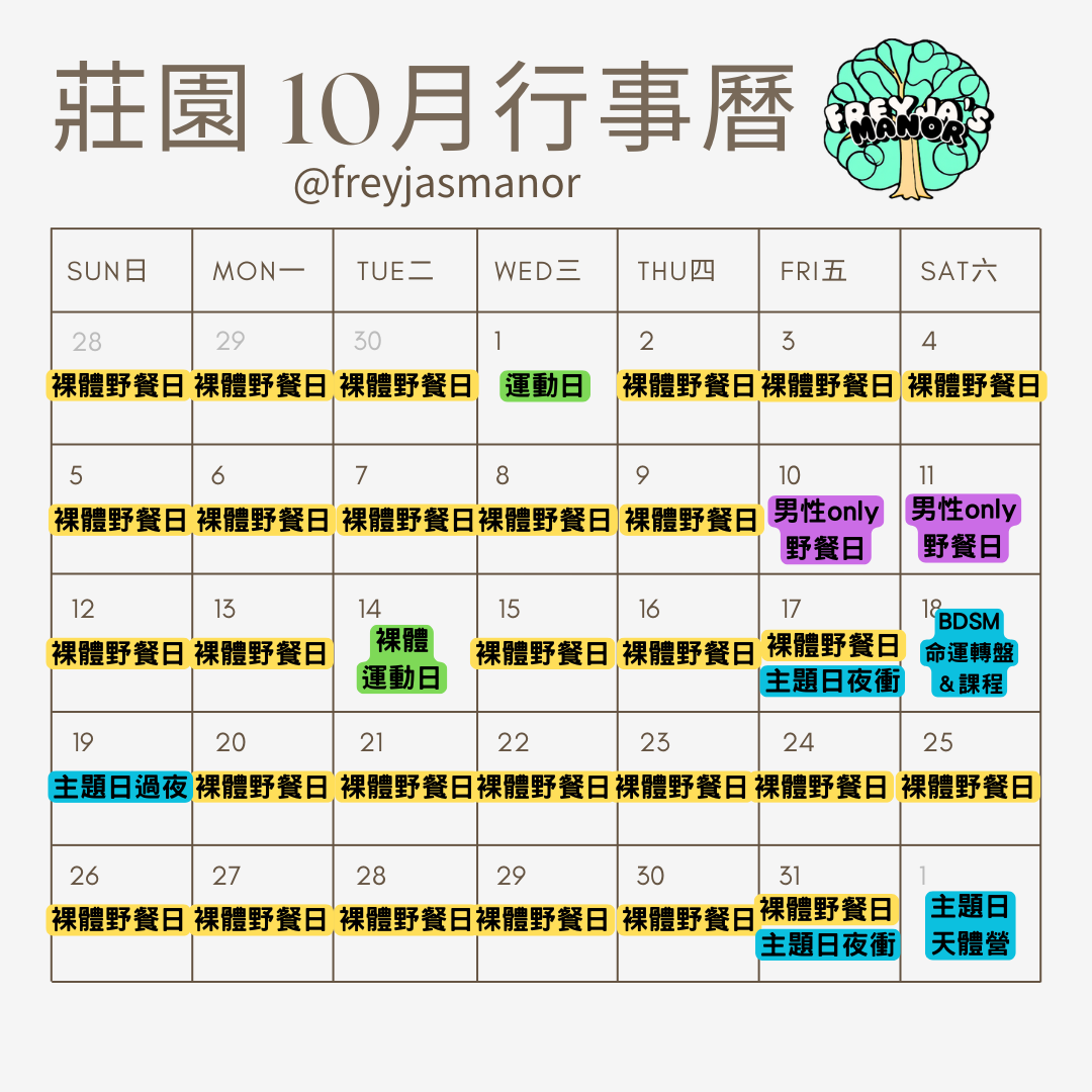 - 下雨天或天氣不好怎麼辦?報名前請自行評估天氣狀況。每個人對於喜歡裸體的天氣不一樣,有些人可能喜歡下雨天裸著淋雨。野餐日只是場地開放日,沒有室內,沒有雨備。野餐日只有開放室外區域,只有野餐跟做自己的事。